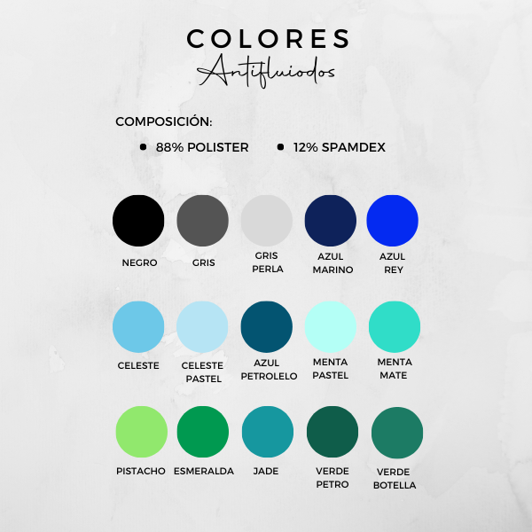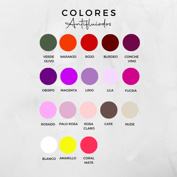 Amarillo ,Amarillo Mantequilla ,Azul Marino ,Azul Rey ,Azul Petroleo ,Celeste ,Celeste Pastel ,Café ,Burdeo ,Conche Vino ,Jade ,Esmeralda ,Verde pastel ,Negro ,Gris ,Gris Perla ,Lila ,Magenta ,Malva ,Obispo ,Blanco ,Nude ,Menta Pastel ,Menta Mate ,Olivo ,Verde Petro ,Verde Botella ,Pistacho ,Rojo ,Naranjo ,Coral Mate ,Rosa Claro ,Palo Rosa ,Rosado ,Fucsia |